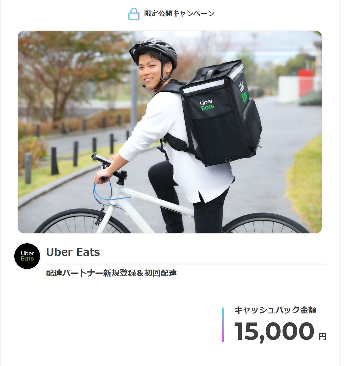 【'26年4月最新】現在、Uber Eats 配達パートナーの紹介キャンペーンとして、新規登録をされた方に、初回配達完了で 15,000円 の紹介料がもらえるキャンペーンを実施中です。全エリア・全車両対象で条件達成に必要な配達回数はたったの1回!大変お得なキャンペーンですので、この機会をぜひお見逃しなく!